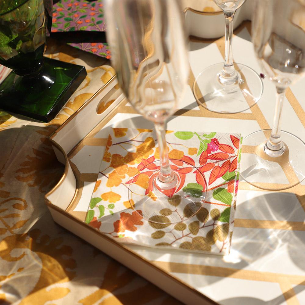 Caspari triple-ply napkins are both striking in design and durable in function. Thoughtfully designed to elevate any occasion, they feature artwork and designs from museums and artist around the world. Each is made of triple-ply tissue and printed in Germany with non-toxic, water-soluble dyes and food-safe ink. They are FSC-certified and made using environmentally-conscious raw materials, which ensures they are both biodegradable and compostable. Our napkins bring eco-friendly style and convenience to your tabletop. 40 napkins included in a gilded gift box with acetate lid. Caspari boxed cocktail napkins make an excellent and useful gift item.