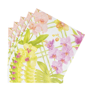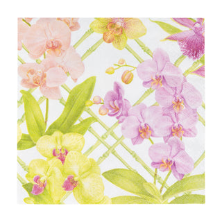 In shades of pink, white & yellow, orchids breathe life into any gathering! Chartreuse bamboo & vibrant orchids set the table in our new Orchid Conservatory design by artist Karen Kluglein.