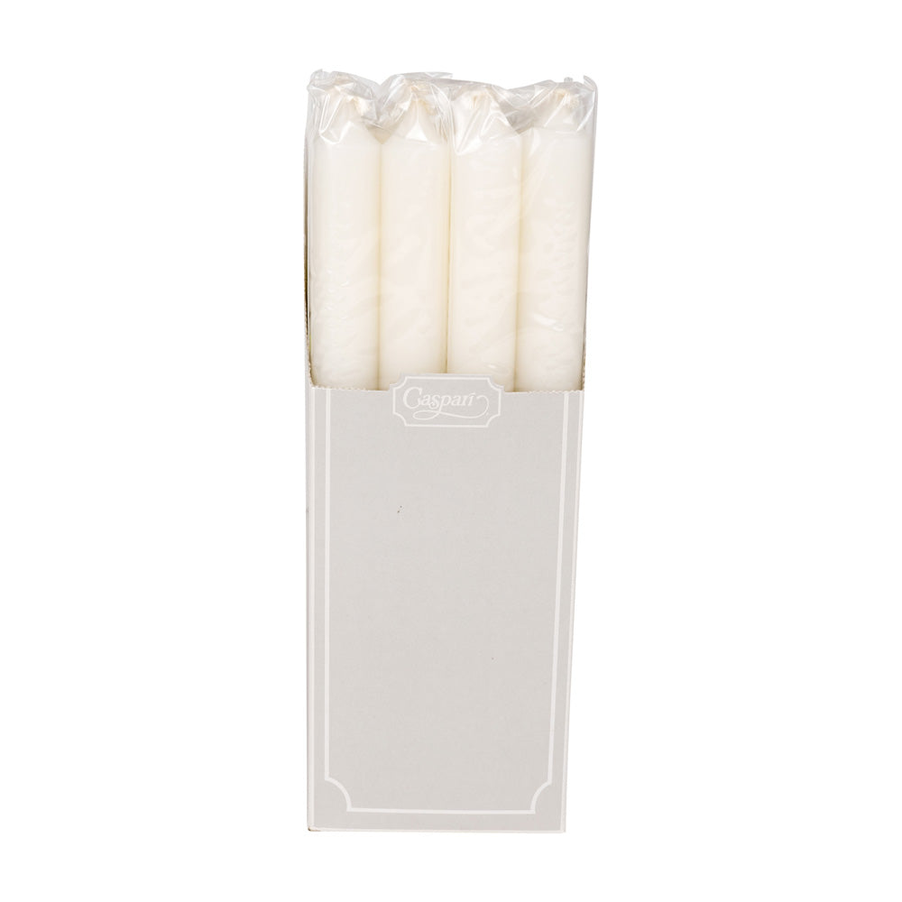 Our elegant 10-inch crown candles are made with a paraffin and palm wax blend. To ensure a clean burn, they feature a lead-free cotton wick. Smokeless and dripless, they can be safely burned from your tabletop to your mantle without worry of a mess. The pairs are available in a variety of beautiful through-colors or metallic finishes. Our assortment that ensures candles are available to coordinate with any Caspari table setting or décor. Effortlessly add warmth and charm to your table when you display any of our crown candles in a standard candlestick or tapered candle holder.
